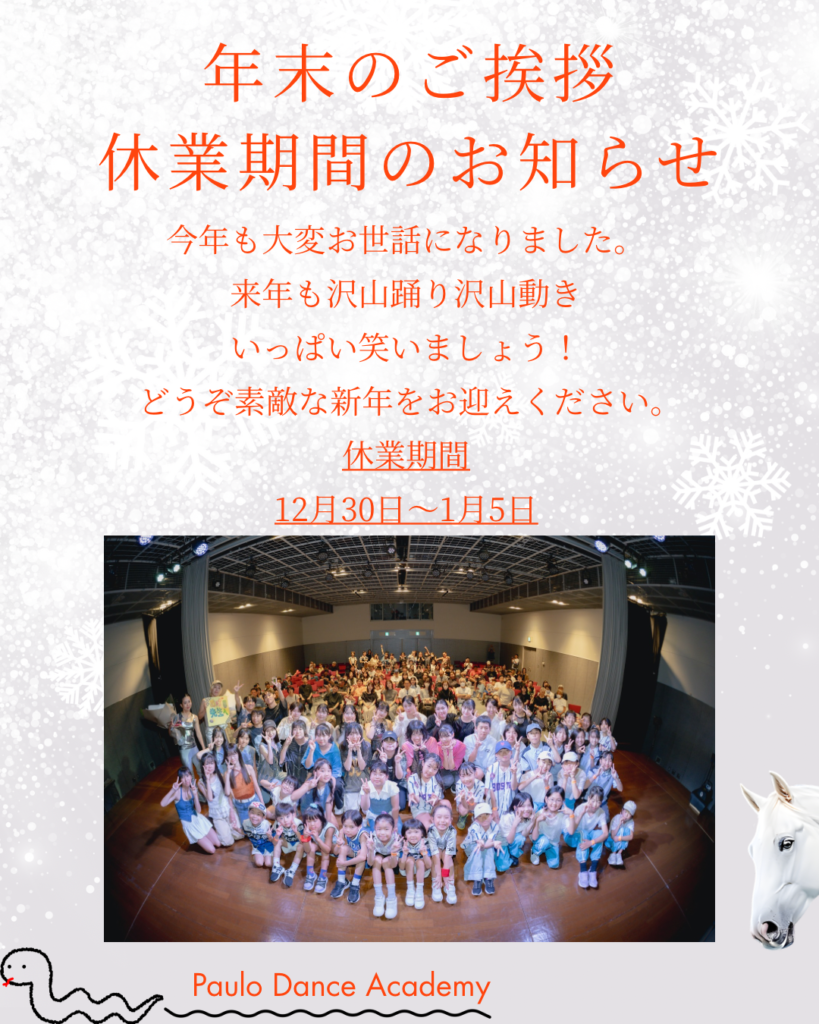 年末年始休業期間お知らせ 公開済み: 2025年12月29日更新: 2025年12月29日作成者: PAULO Dance Academyカテゴリー: 未分類 皆さま今年も一年間ありがとうございました✨来年も元気な姿でお会いできる事楽しみにしております。より一層楽しく成長できる一年になる事を願っております🙏 年末年始良い時間をお過ごしください✨ 【休業期間】12月30日〜1月5日 ※お問い合わせ、連絡の返信などもお休みさせて頂きます。休業期間にいただきましたご連絡は1月6日から順次返信させて頂きます。ご理解のほどよろしくお願い致します。 関連記事 09 スタジオオープンしました★ 皆様のご協力もあり7月1日、無事にスタジオオープンすることが出来ました★ 嬉しいことにさっそく沢山の生徒さん達が受講されています。 自粛生活明けのレッスンということでストレッチ、軽いトレーニングから丁寧に進めていきました […] 公開済み: 2020年7月9日更新: 2020年7月9日作成者: PAULO Dance Academyカテゴリー: 未分類 12 8月12日から17日は休講日です! 今週はお盆のためレッスン休講となります🙇♀️お間違いないようお願いいたします🙏 また来週のレッスンでたくさん踊り、体動かしましょー✨ […] 公開済み: 2025年8月12日更新: 2025年8月12日作成者: PAULO Dance Academyカテゴリー: 未分類 11 一周年 PAULO Dance Academy は7月1日で一周年を迎えました! 皆様のおかげで楽しく充実した一年を迎えることができ大変嬉しく思います。 そしてこのような今まで通りとはいかない状況の中ではありますが皆様のご理解 […] 公開済み: 2021年7月11日更新: 2021年7月11日作成者: PAULO Dance Academyカテゴリー: 未分類タグ: 千里山ダンススクール, 千里山ダンススタジオ, 千里山ピラティス, 緑地公園駅ダンススクール この投稿へのトラックバック トラックバックはありません。 トラックバック URL
